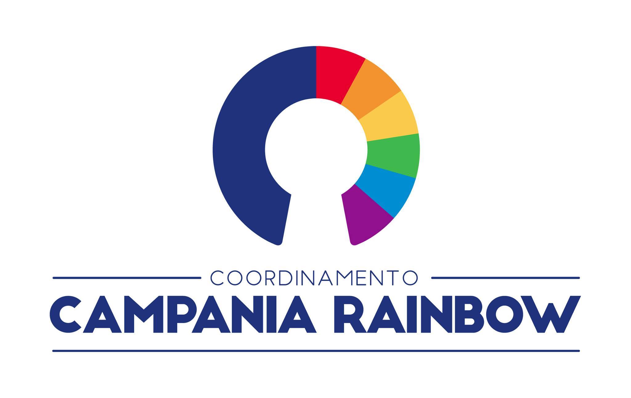 Il logo e marchio del Coordinamento Campania Rainbow, come di seguito illustrato, è composto da una lettera “C” capovolta a formare un anello di una serratura, i due bracci della C sono uno nei 6 colori rainbow ( braccio destro), l’altro con il blu (pantone 280) della Regione Campania ( braccio sinistro). Sotto la C compare la scritta Coordinamento e a seguire Campania Rainbow dello stesso blu del braccio sinistro della C.